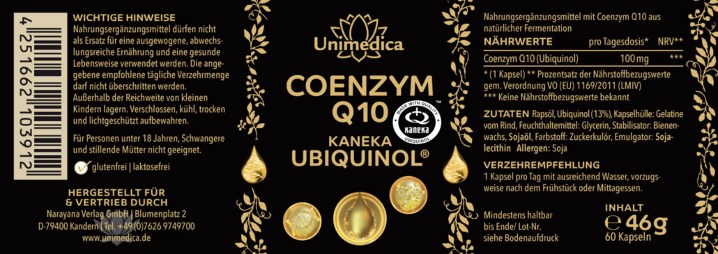 Coenzym Q10 KANEKA Ubiquinol® von Unimedica ist, entsprechend gesetzlichen Vorgaben, frei von Konservierungsstoffen, weiterhin ohne Zusätze wie Farbstoffe, Stabilisatoren, Trennmittel wie Magnesiumstearat, ohne Gentechnik sowie laktosefrei und glutenfrei.