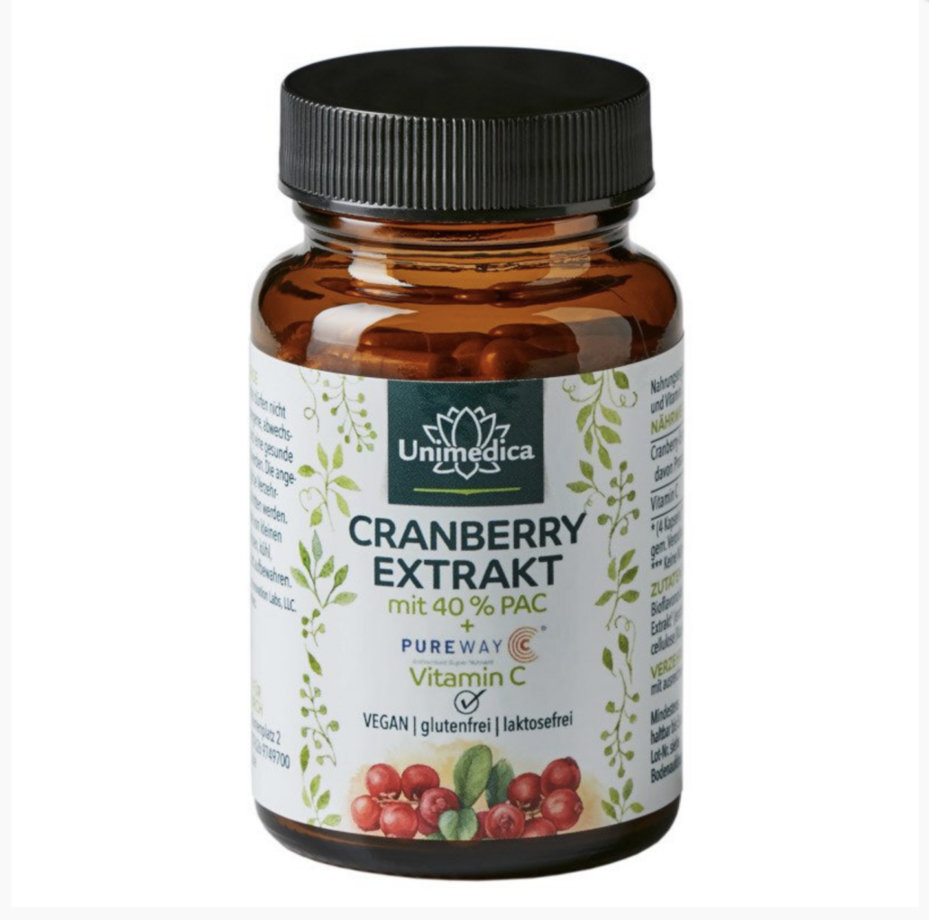 Für die Cranberry-Extrakt Kapseln von Unimedica wird reichhaltiger Premium-Extrakt aus luftgetrockneten Cranberries verwendet. Die auch als Moosbeere bekannten Früchte stammen ursprünglich aus Nordamerika und gelten aufgrund ihrer hohen Nährstoffdichte als Superfood.