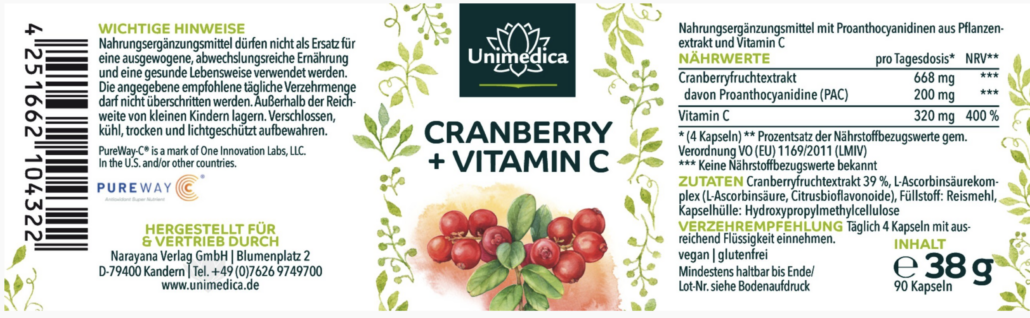 Cranberry Extrakt Kapseln von Unimedica sind, entsprechend gesetzlichen Vorgaben, frei von Konservierungsstoffen, weiterhin ohne Zusätze wie Farbstoffe, Stabilisatoren, Trennmittel wie Magnesiumstearat, ohne Gentechnik sowie laktosefrei, glutenfrei und vegan.