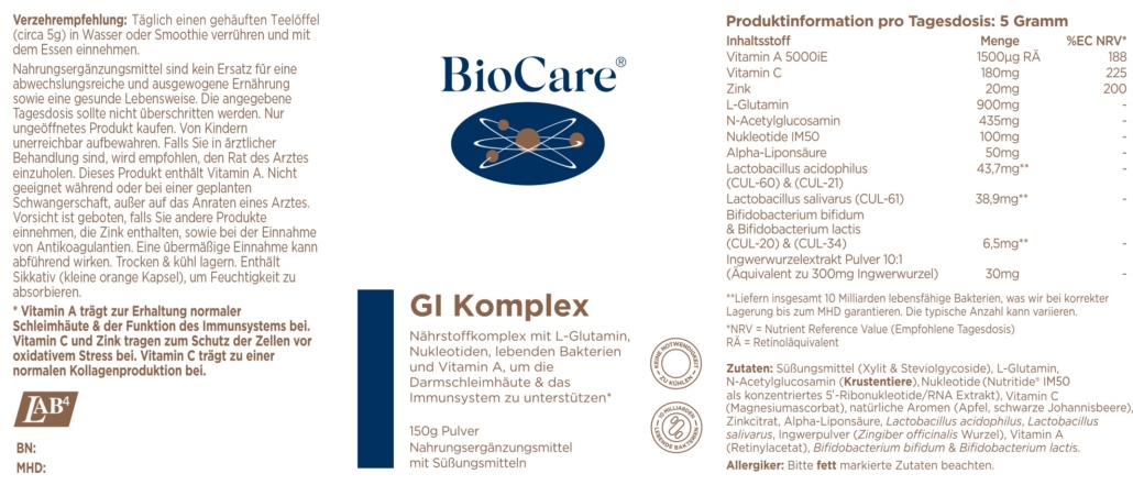 - Effektiv für die Verdauung: Eine ausgeklügelte Kombination aus Glutamin, N-Acetylglucosamin, Nukleotiden, Alpha-Liponsäure, Ingwer, probiotischen Bakterien inklusive Lactobacillus Salivarius, Antioxidantien: Vitamin A & C und Zink.