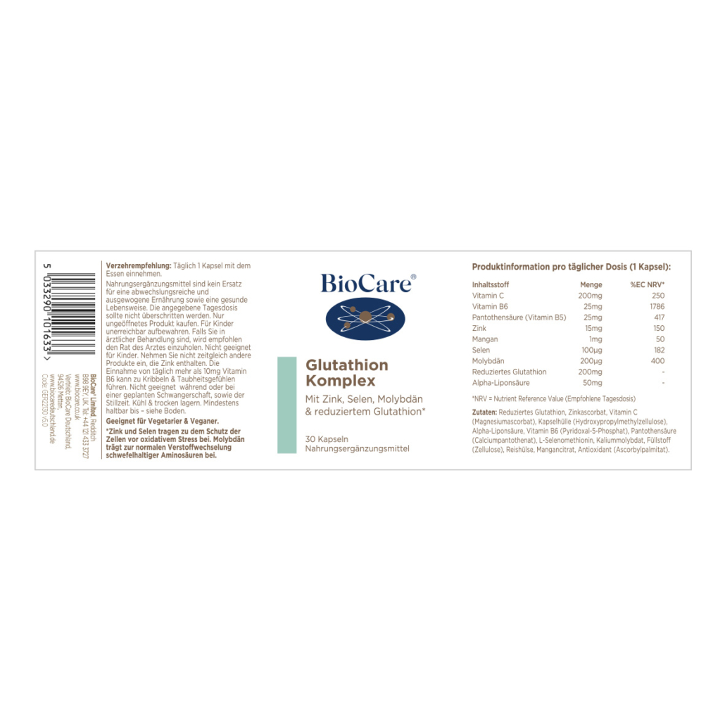 Ein einzigartiger Nährstoffkomplex mit reduziertem Glutation, Vitamin C, B6, Zink, Molybdän & Selen. Zusammen tragen diese Stoffe dazu bei, die Zellen vor oxidativem Stress zu schützen und die normale Funktion des Immunsystems zu unterstützen.