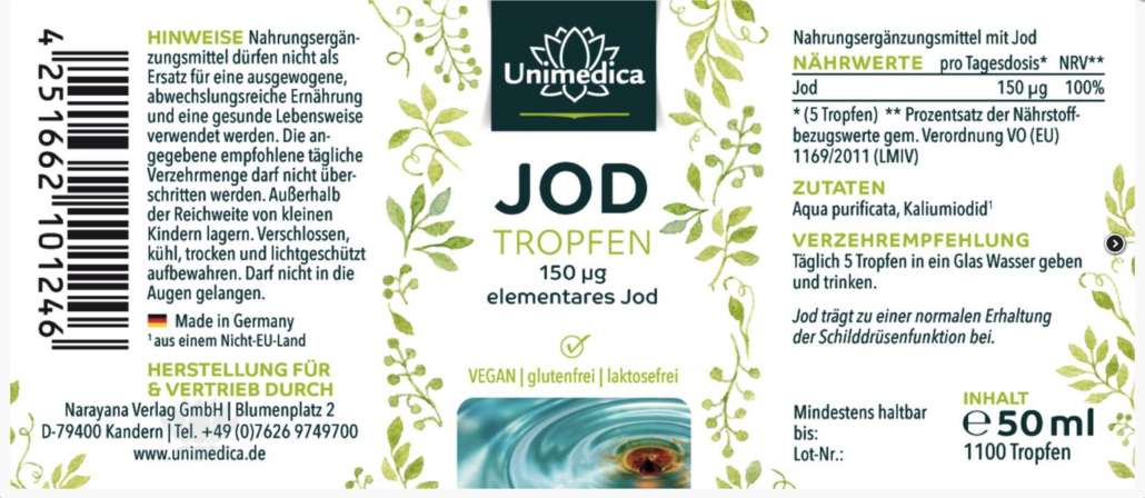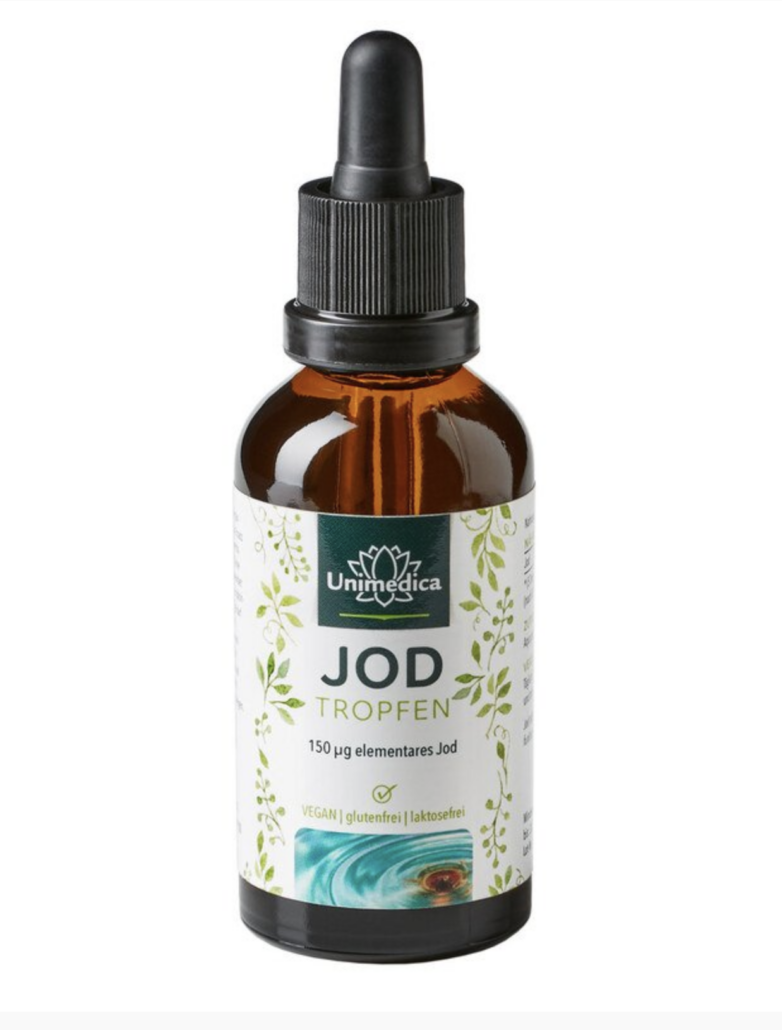 Jod Tropfen von Unimedica werden in Deutschland hergestellt und enthalten hochdosiertes elementares Jod in Form von Kaliumiodid. Jede Tagesdosis (5 Tropfen) Jod Tropfen von Unimedica enthält 150 µg elementares Jod.