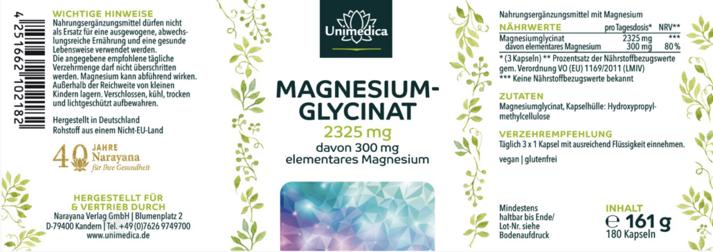Diese Magnesium-Kapseln von Unimedica enthalten Magnesiumglycinat. Dabei ist das Magnesium an die Aminosäure Glycin gebunden (Chelat). Es ist besonders schonend und gut vom Körper absorbierbar. Magnesiumglycinat-Kapseln von Unimedica enthalten je Kapsel 100 mg elementares Magnesium, das der Körper am schnellsten verarbeiten kann.