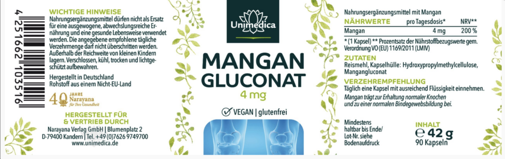 In Mangan Kapseln von Unimedica liegt das Mangan in seiner sehr gut resorbierbaren Form Mangangluconat vor. Das heißt, es wird leicht vom Körper aufgenommen, dorthin transportiert und leicht verarbeitet, wo es gebraucht wird. Jede Kapsel enthält 4 mg Mangangluconat.