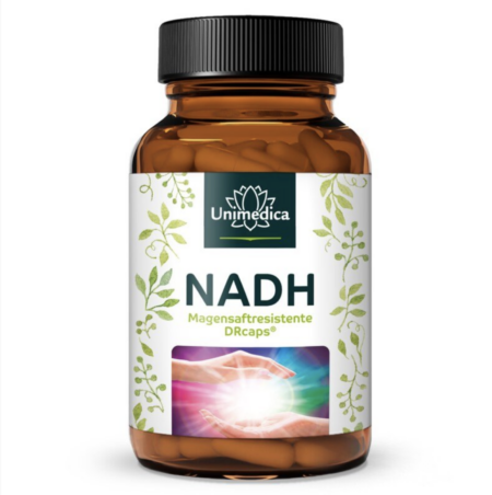 NADH-Kapseln von Unimedica enthalten je Kapsel 50 mg NADH-Pulver. Durch die Verkapselung in veganen DRCaps® funktionieren NADH-Kapseln von Unimedica effizienter als flüssiges NADH oder NADH-Pulver. Die DRCaps® sind magensaftresistent und so wird der wertvolle Inhaltsstoff unbeschadet erst im Dünndarm freigesetzt.
