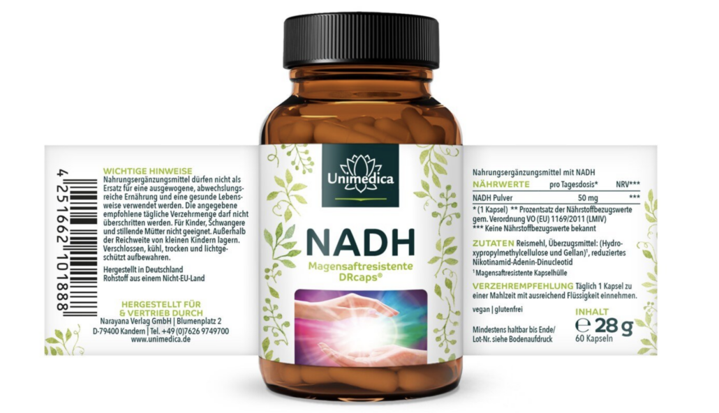 NADH-Kapseln von Unimedica enthalten je Kapsel 50 mg NADH-Pulver. Durch die Verkapselung in veganen DRCaps® funktionieren NADH-Kapseln von Unimedica effizienter als flüssiges NADH oder NADH-Pulver. Die DRCaps® sind magensaftresistent und so wird der wertvolle Inhaltsstoff unbeschadet erst im Dünndarm freigesetzt.