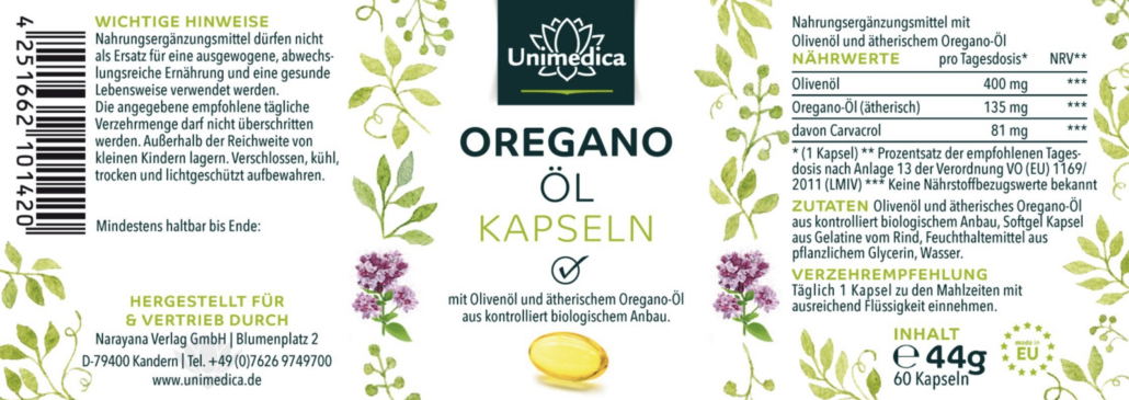Oreganoöl Kapseln von Unimedica sind frei von Aromen, Farbstoffen, Stabilisatoren, Magnesiumstearat sowie gentechnikfrei, laktosefrei und glutenfrei.
