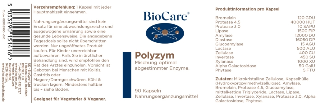 Polyzym ist eine Kombination aus Enzymen wie Bromelain, Lipase, Protease, Amylase, Cellulase, Lactase und Maltase aus Pflanzen, sowie lebenden Lactobacillus acidophilus Bakterien.