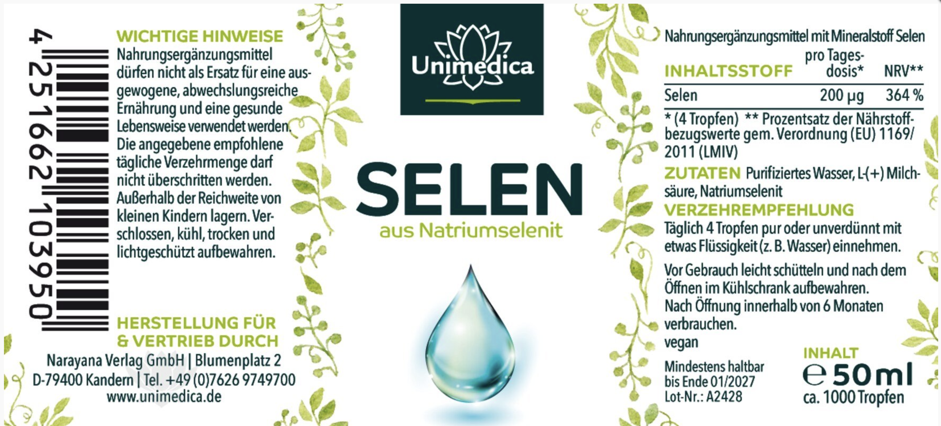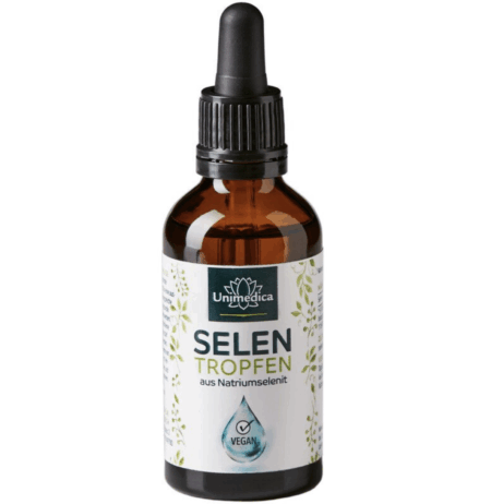 Selen ist ein sehr wichtiges Spurenelement für unseren Körper, vor allem für die Schilddrüse. Selen schützt zudem die Zellen vor oxidativem Stress, unterstützt das Immunsystem und kräftigt Haare und Nägel. Selen Tropfen von Unimedica decken den empfohlenen Tagesbedarf an Selen zu 364 %. Selen Tropfen von Unimedica enthalten die anorganische Form von Selen: Natriumselenit.