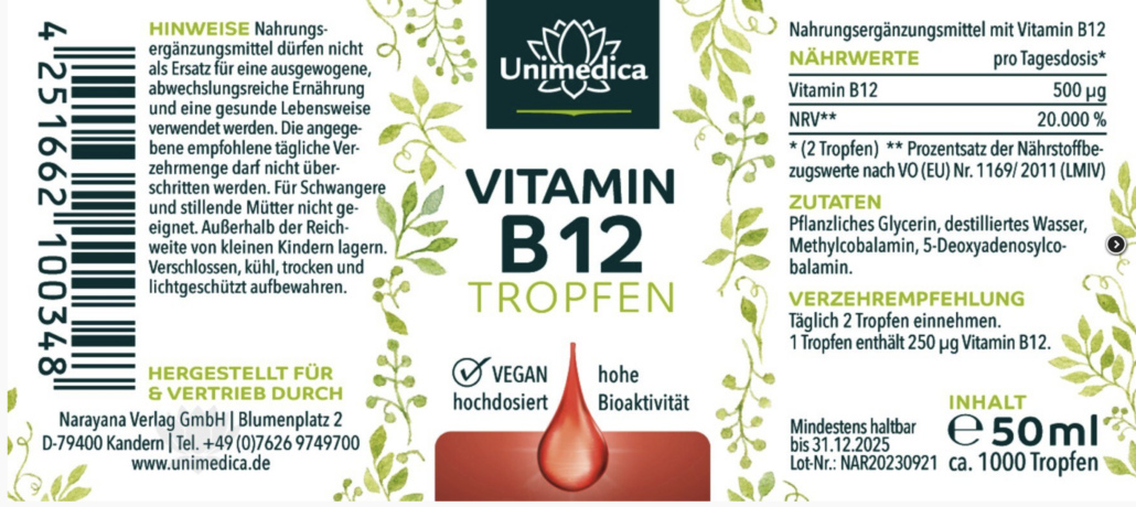 Gleichzeitig enthält nun jeder Vitamin B12 Tropfen von Unimedica jeweils 50 µg mehr Methyl- und Adenosylcobalamin (bioaktives B12) zur Unterstützung von Stoffwechsel und Immunsystem.